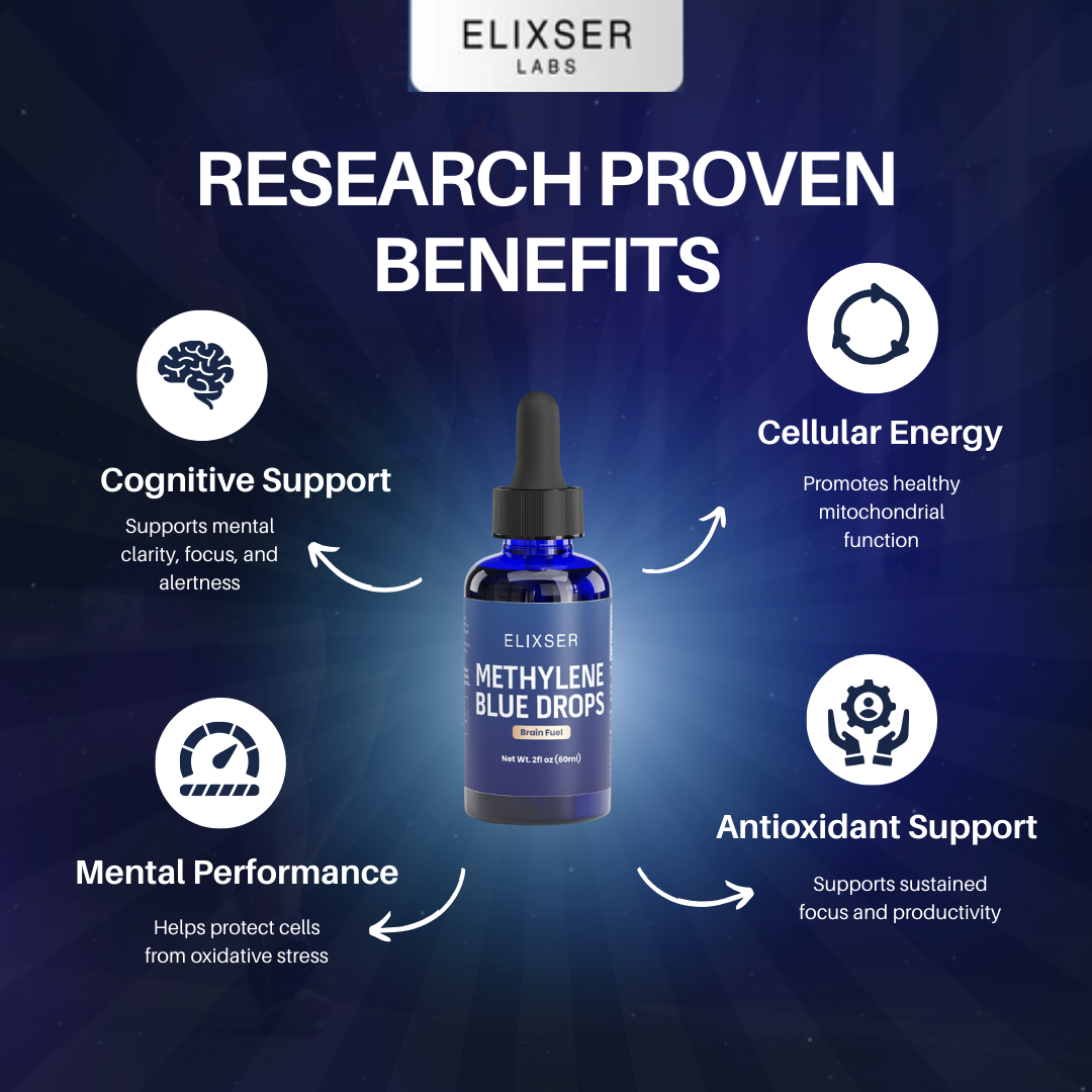 Methylene Blue enhances the efficiency of mitochondria in brain cells, leading to increased cellular energy (ATP). This results in improved focus, memory retention, and overall cognitive resilience.