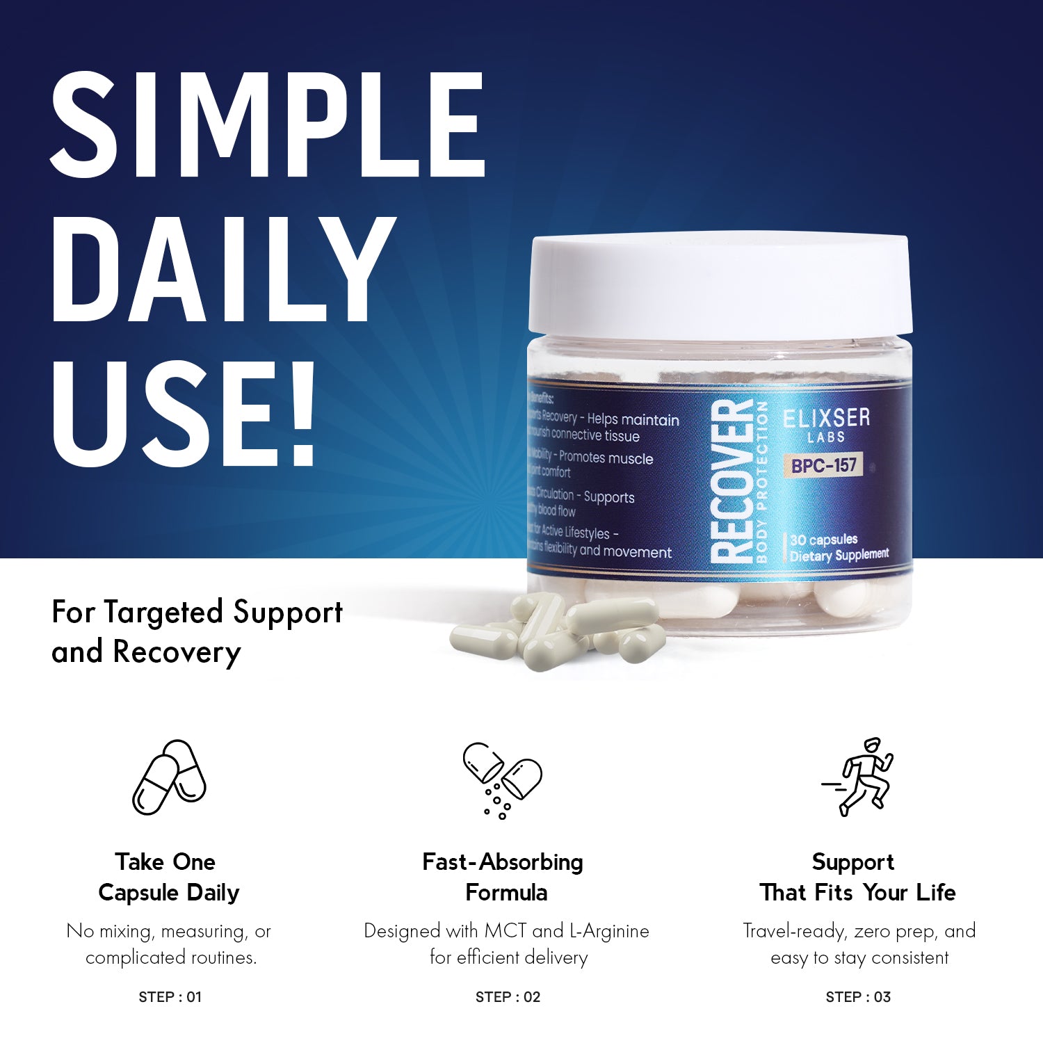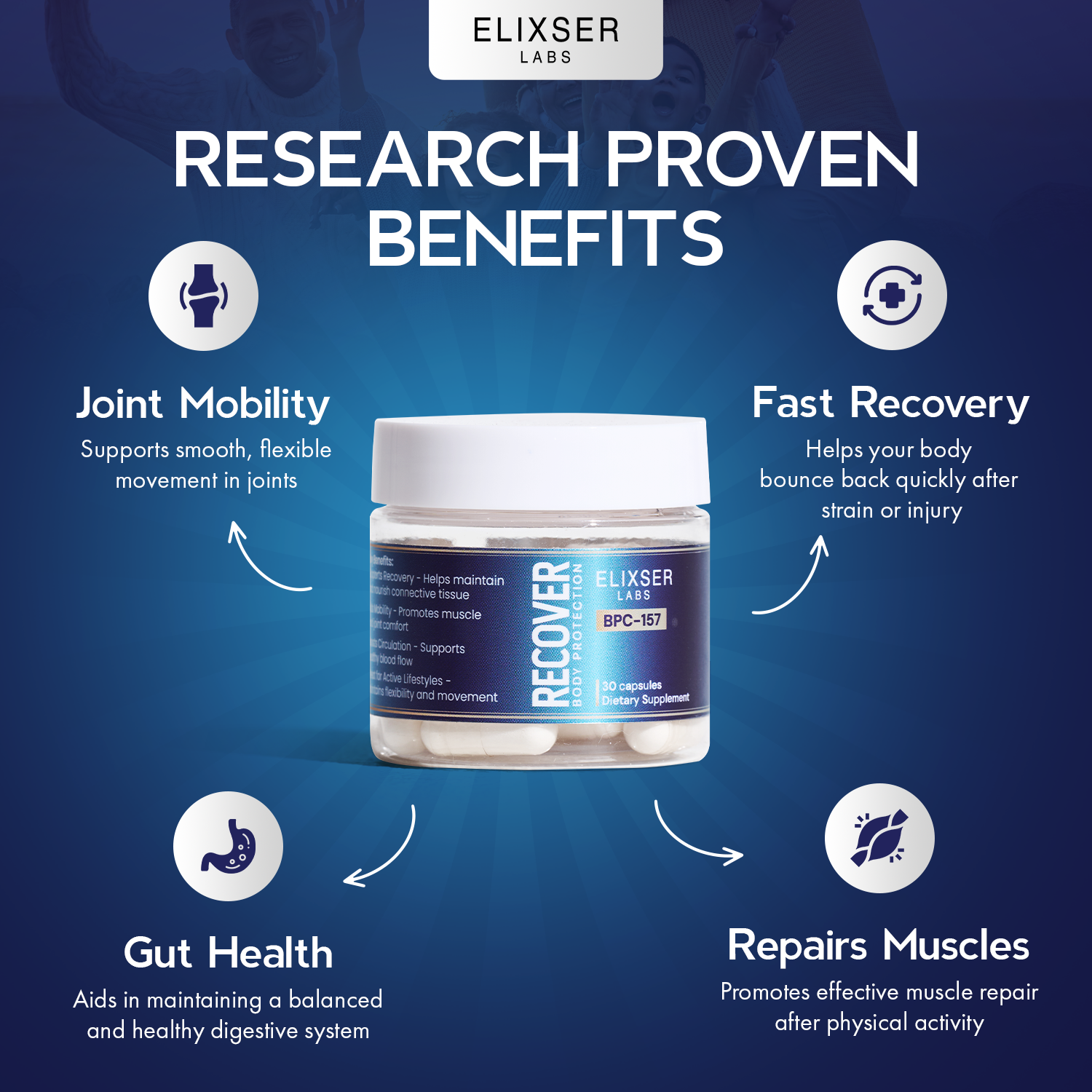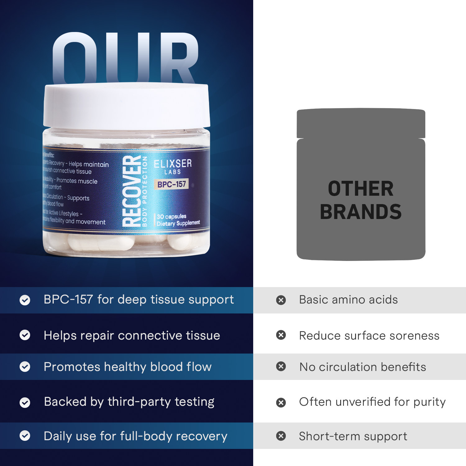 After a stubborn knee injury kept coming back, I was limping around in frustration icing, elevating, and getting nowhere. BPC-157 changed everything. It worked fast, but injections didn’t fit my life. That’s why we created Elixser Recover: a capsule with high-grade BPC-157 and absorption boosting ingredients like MCT and L-Arginine HCl. Built for guys who train, play, and don’t want pain holding them back. At Elixser, we believe in transparency, integrity, and showing up on the field and in life.